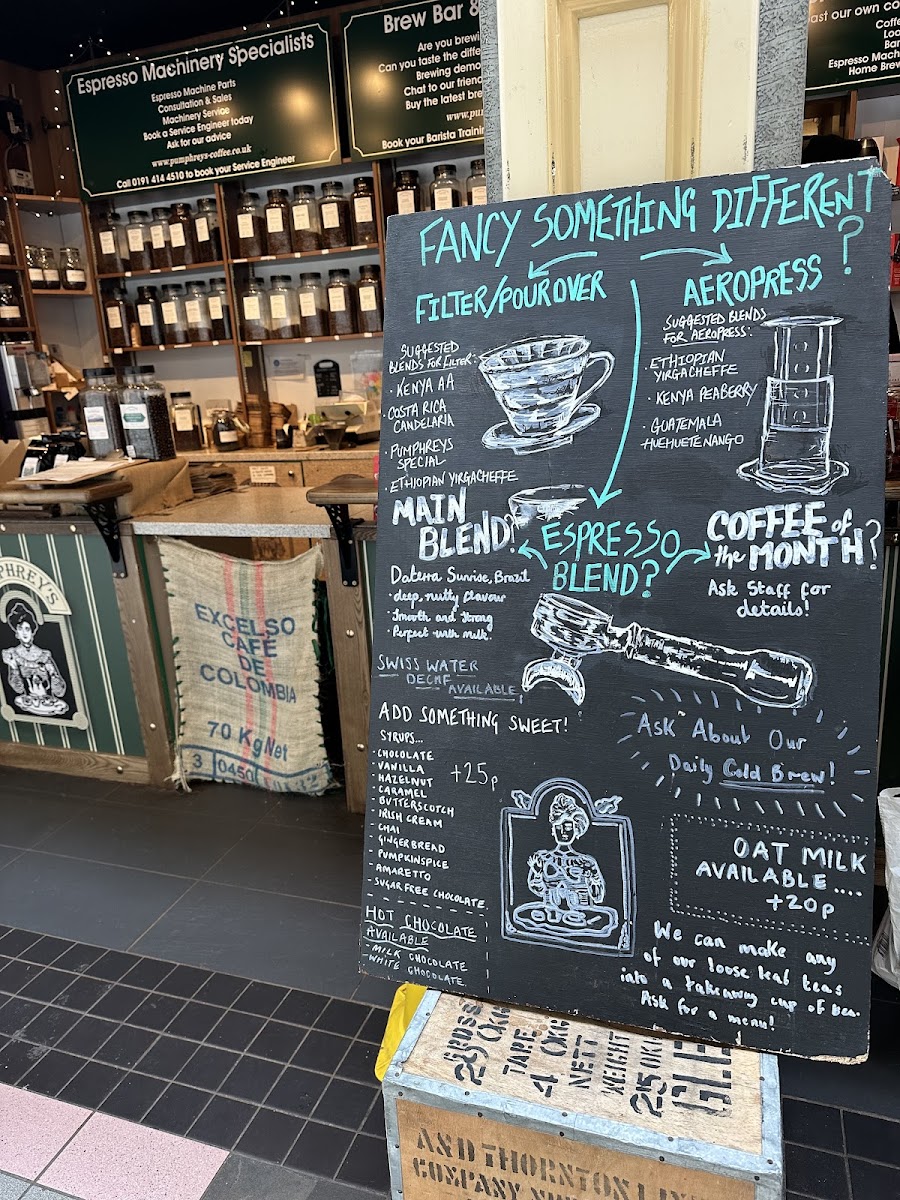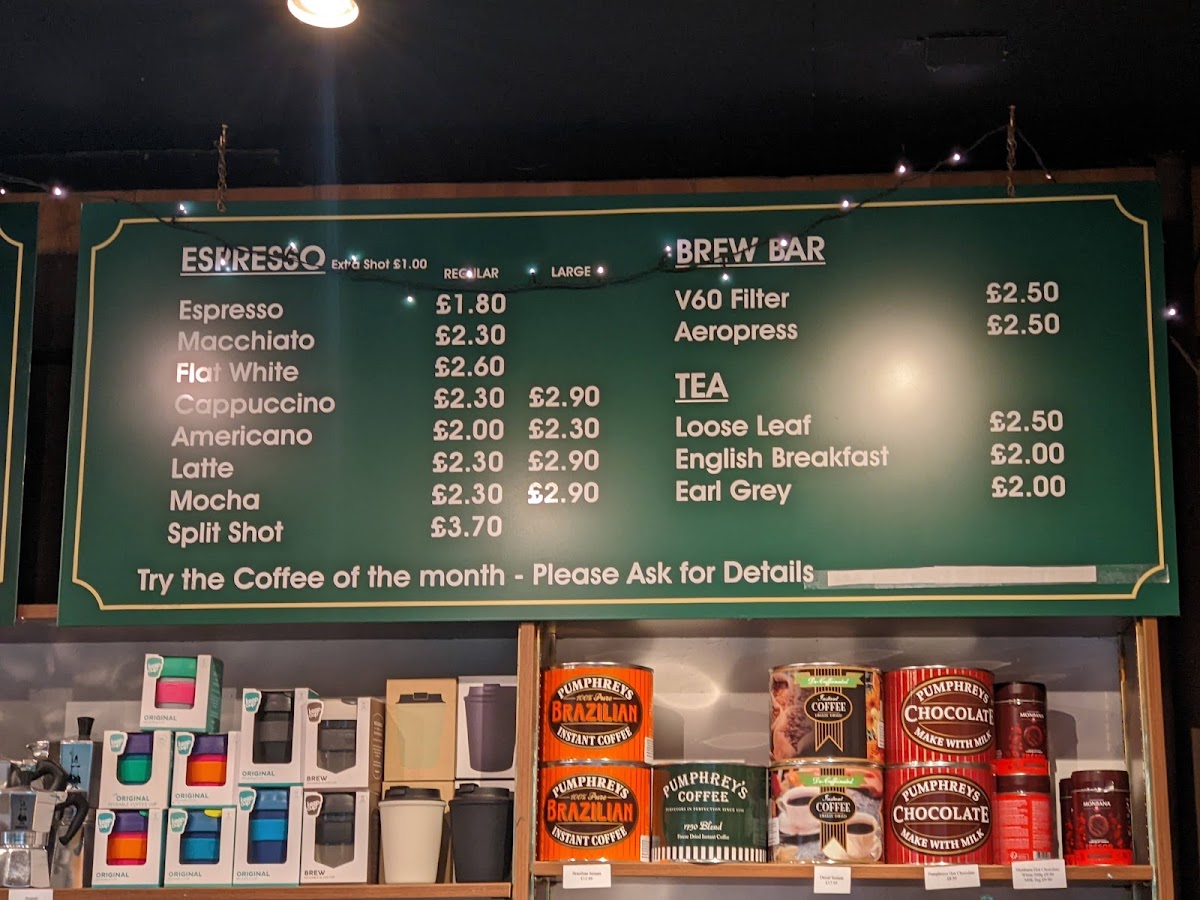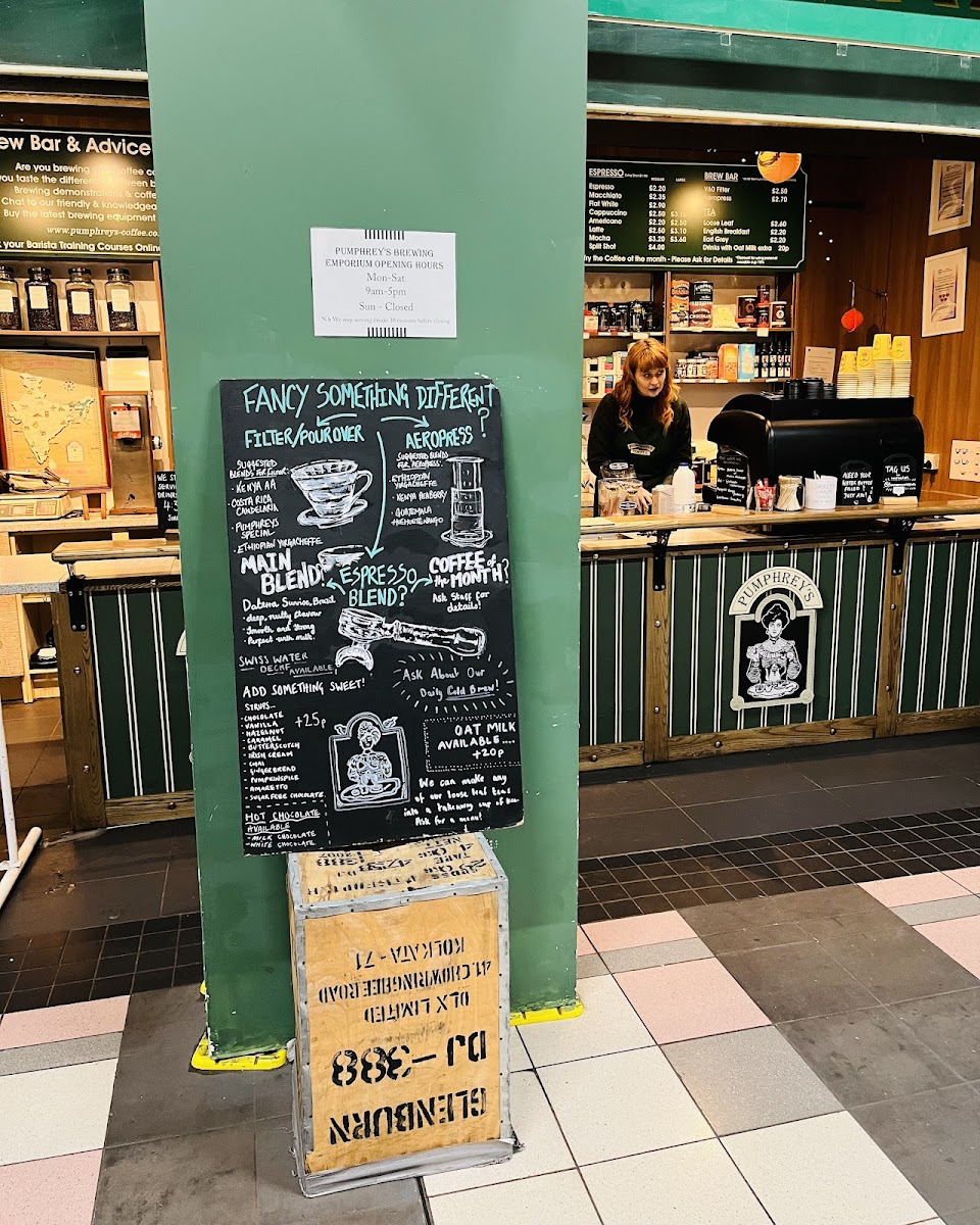 At Pumphreys Coffee Centre And Brewing Emporium, located in the heart of Grainger Market in Newcastle, you’re in for a treat if you’re a coffee lover or a brewing enthusiast. The menu offers a delightful selection of rich, aromatic coffee blends, each brewed to perfection. Whether you’re in the mood for a strong espresso, a creamy cappuccino, or something more adventurous like a pour-over or cold brew, there’s something to satisfy every taste. Alongside these specialty drinks, you’ll find an array of delicious pastries and light bites that pair perfectly with your coffee. Each offering is carefully chosen to bring out the best in your coffee experience, making it the perfect spot for a quick break or a leisurely sit-down. With its inviting atmosphere, it’s no wonder this place is a local favorite.
