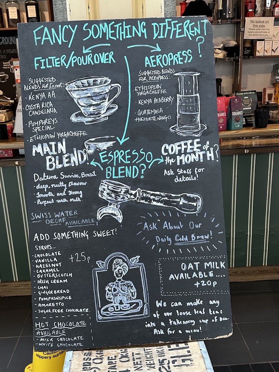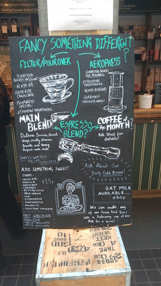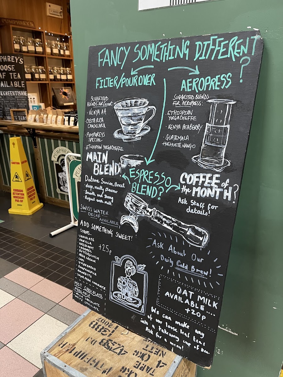 At Pumphreys Coffee Centre And Brewing Emporium, located in the heart of Grainger Market in Newcastle, you’re in for a treat if you’re a coffee lover or a brewing enthusiast. The menu offers a delightful selection of rich, aromatic coffee blends, each brewed to perfection. Whether you’re in the mood for a strong espresso, a creamy cappuccino, or something more adventurous like a pour-over or cold brew, there’s something to satisfy every taste. Alongside these specialty drinks, you’ll find an array of delicious pastries and light bites that pair perfectly with your coffee. Each offering is carefully chosen to bring out the best in your coffee experience, making it the perfect spot for a quick break or a leisurely sit-down. With its inviting atmosphere, it’s no wonder this place is a local favorite.
